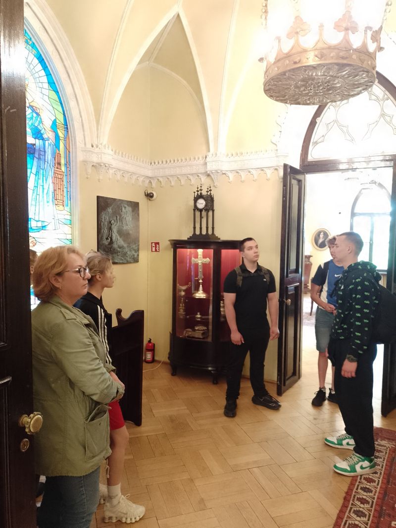 Kilka razy słyszałem, iż nie ma tam co zwiedzać, że jest nudno, ale kto nie ryzykuje... Skoro jest tam pałacyk, jest tam park, to warto odwiedzić. Kolekcjonujemy wizyty w zamkach, pałacach i dworkach. Krótka rozmowa z grupą i ruszamy. Na miejscu jesteśmy pierwsi. Rozpoczynamy zwiedzanie z panią przewodnik przed czasem otwarcia. Kontakt młodzieży z panią przewodnik szybko osiąga poziom prawie koleżeński. Atmosfera wspaniała. Opowiadania, pytania i uśmiechy. Dużo dygresji. Mamy o czym rozmawiać. Są żarty i... zguby. Po wyjściu z zameczku jest nas mniej. Piotr szybko reaguje, że nie ma jednego z naszych. Wiemy już co się stało. Wszyscy w śmiech łącznie z panią przewodnik i ochroniarzem, który zamknął drzwi obiektu. W tym momencie ktoś szarpie za klamkę od wewnątrz i stuka w drzwi. Jest zguba, która - nie zauważona - robiła zdjęcie jednemu z eksponatów.