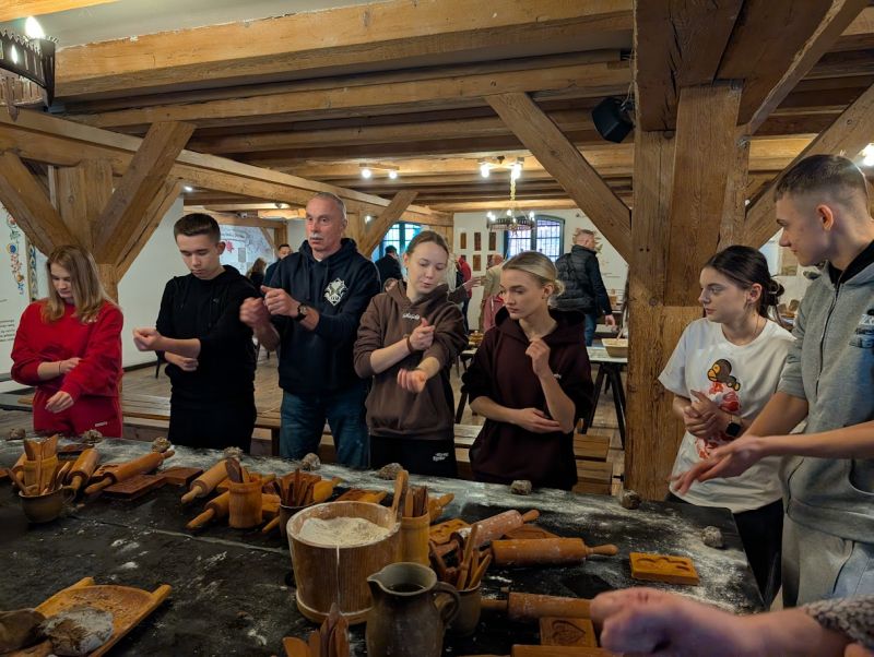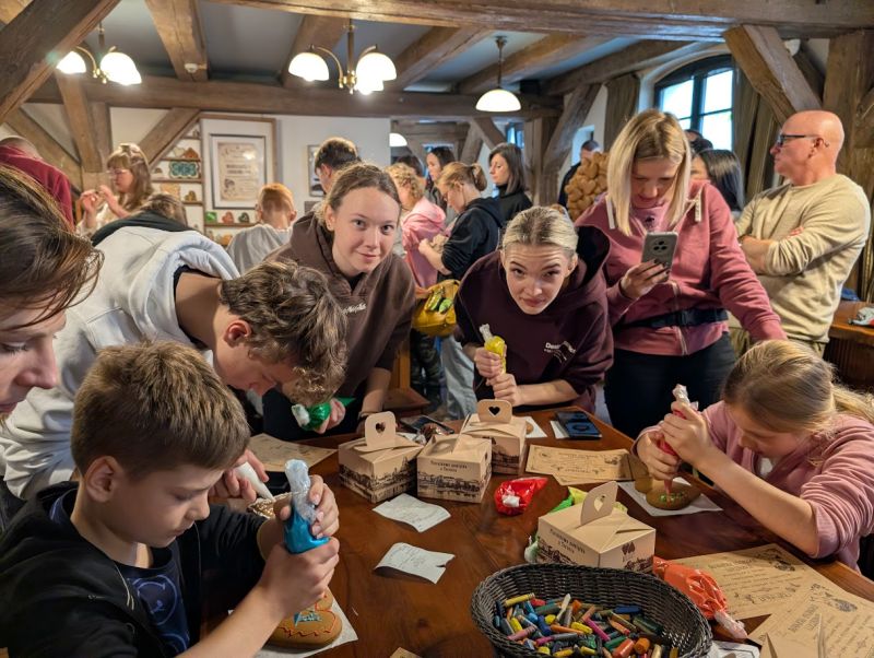 Pierwszym punktem sobotniego programu były warsztaty w Żywym Muzeum Piernika. Tam przywitał nas dowcipnie mistrz czeladniczy zapraszając do wspólnego przygotowania piernika. Po pełnym humoru i lekkości wprowadzeniu i złożeniu przysięgi, że dochowamy tajemnicy, przystąpiliśmy do przygotowania ciasta zgodnie ze średniowieczną recepturą. Następnie uformowaliśmy własnoręcznie pierniki, które trafiły do rozgrzanego pieca. Na drugim piętrze Muzeum mogliśmy osobiście przyozdabiać wcześniej wypieczone pierniki. Każdy wychodził z warsztatów z własnym piernikiem. Osoby, które zdecydowały się na przyozdabianie, także z tym drugim piernikiem.