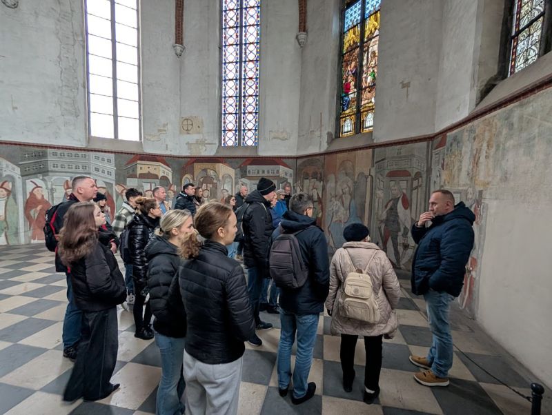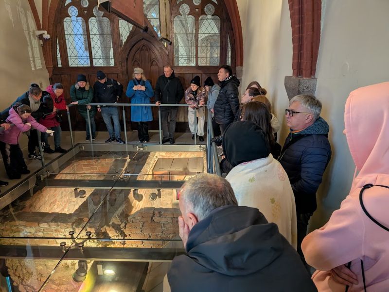 Drugi dzień wyjazdu chętni zaczęli od uczestnictwa w porannej Mszy Św. w toruńskiej katedrze Św. Jana Ewangelisty i Jana Chrzciciela. Potem sprawnie przygotowaliśmy i zjedli śniadanie, a następnie przemieścili się na parking i wyjechali w stronę Kwidzynia. Dotarliśmy tam przed godziną 11. Najpierw udaliśmy się na zamek i zwiedzili go przy pomocy audio-przewodników. Wystawy w obiekcie nie miały wiele wspólnego z jego historią, pełnionymi przez wieki funkcjami i Zakonem Krzyżackim, ale zamek został zachowany w bardzo dobrym stanie i samą wartością było przejście się jego wnętrzami i obejrzenie z bliska niespotykanych nigdzie indziej wieży studziennej i gdaniska wraz z krytymi gankami (biegnącym na wysokości pierwszego piętra), którymi są połączone z zamkiem. Wiedzę na temat mistrzów zakonnych, fortyfikacji, prób jej zdobycia uzupełniliśmy zwiedzając Krypty Wielkich Mistrzów Krzyżackich i konkatedrę przylegającą do zamku (to jedyne takie rozwiązanie w całej Europie!). O wszystkim opowiedział nam w zajmujący i dowcipny sposób niezrównany przewodnik pan Adam Nosko.