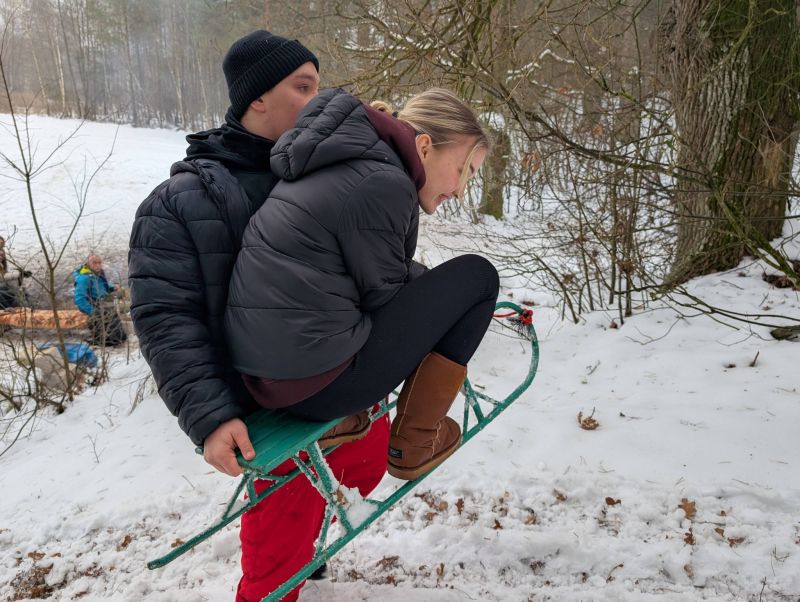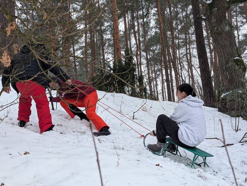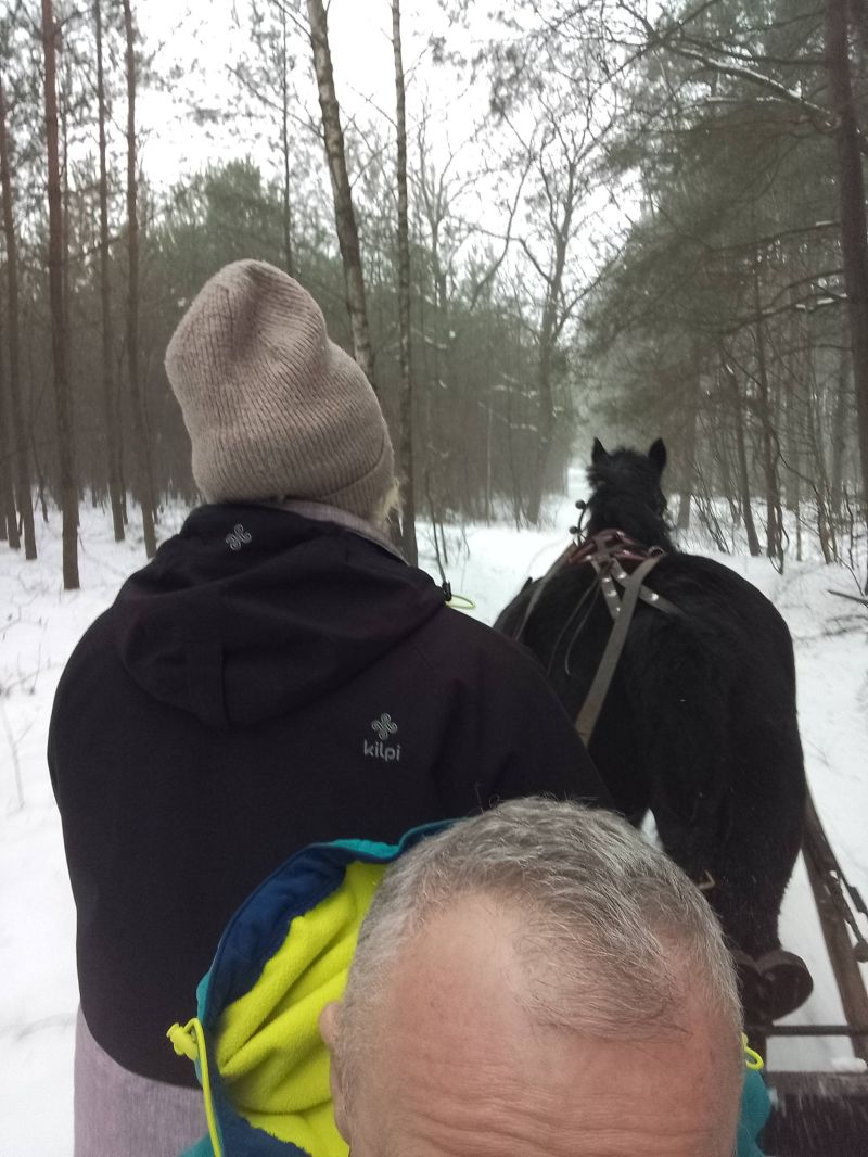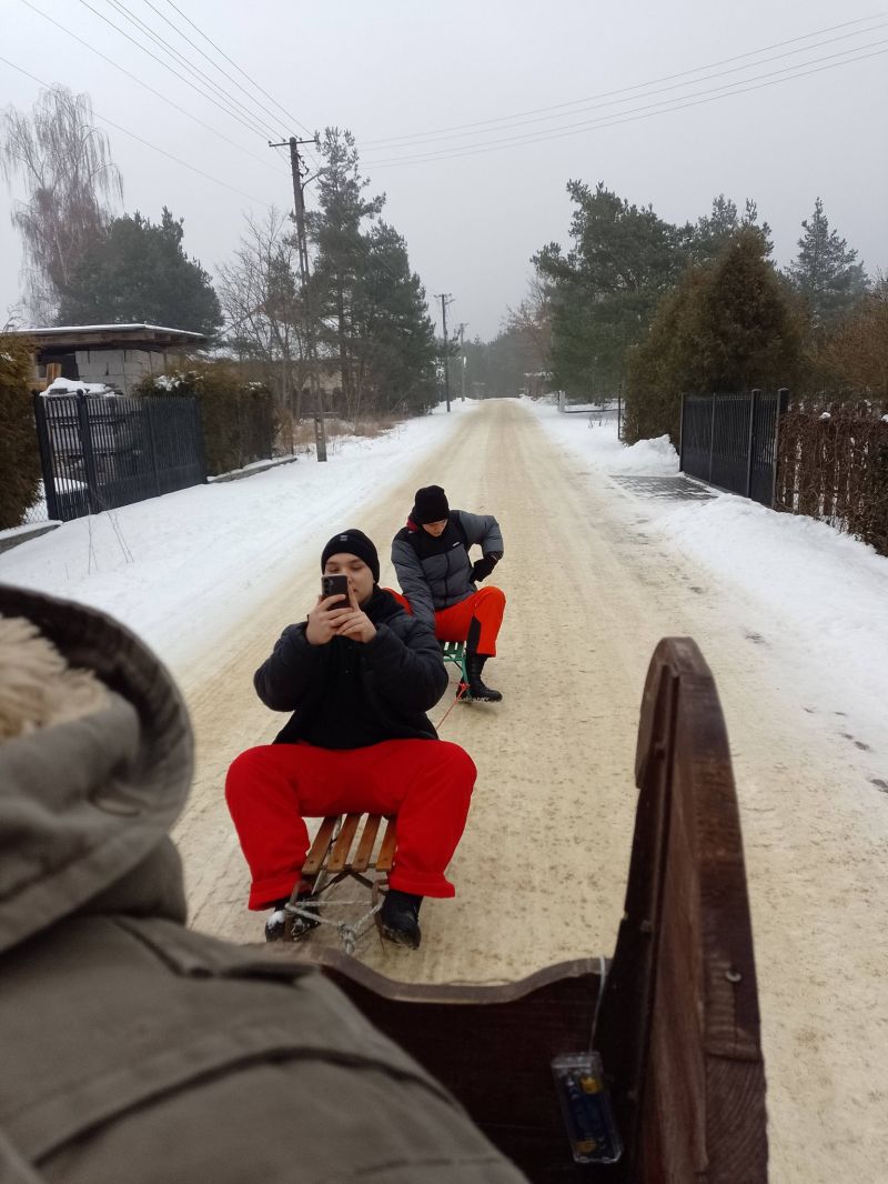 Jak to już bywa, że odważnym szczęście sprzyja tak i nam też się powidło. Temperatura ok. zera, lekka mgiełka, sanie, sanki i żywy koń. To już atrakcja! Pani Joanna z uśmiechem wita wszystkich. Uśmiechy na buziach. Zaczyna się bitwa śnieżkami, przewrotki, zabawa i urocze dokuczanie sobie nawzajem. Zjazdy na sankach, Piotr mogący robić za wyciąg, ognisko, kiełbaska i niesamowite wrażenie, o czym każdy powiedział na zakończenie.
